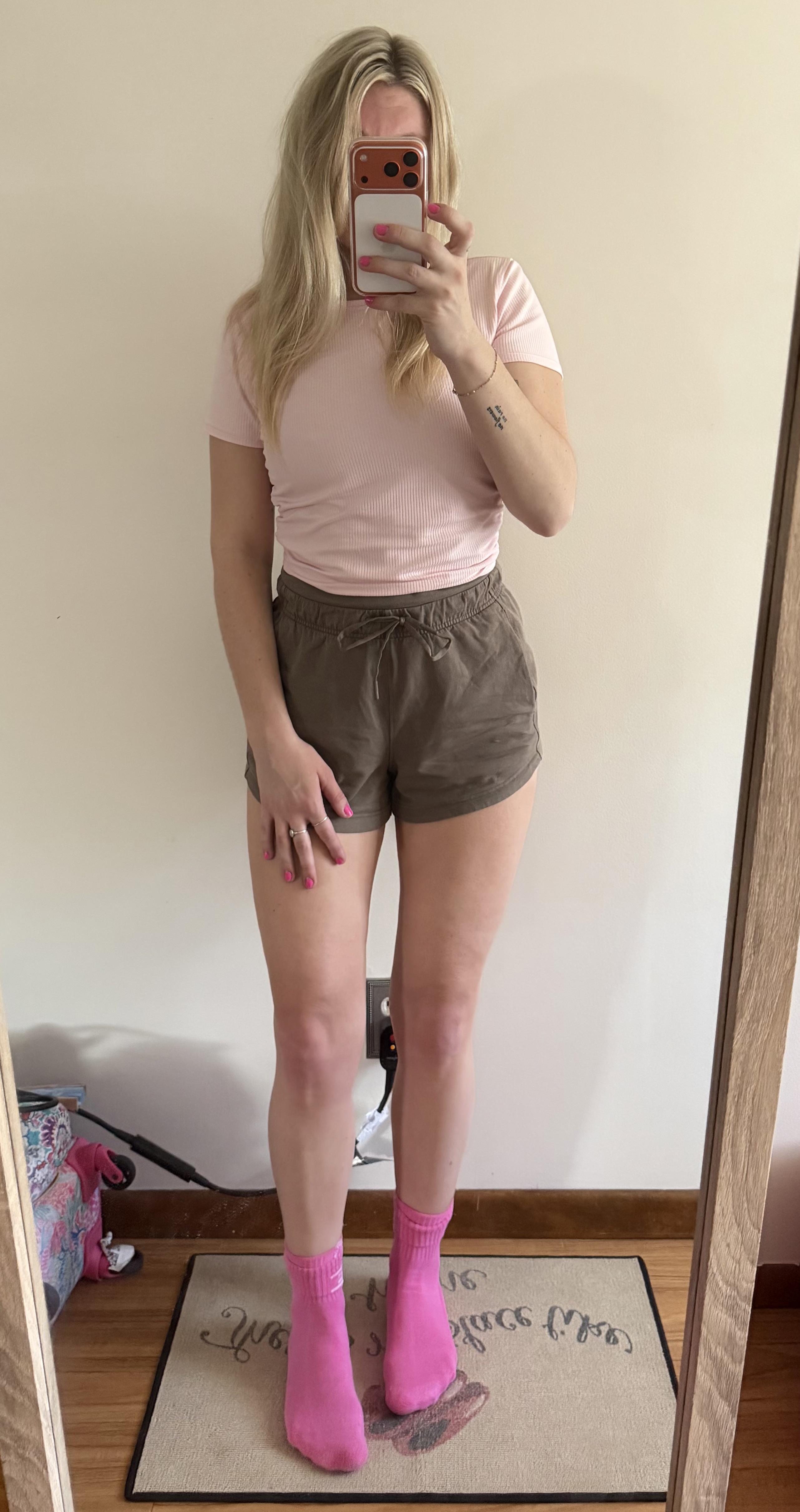 side cinched tee strawberry milkshake paired with nomad inner glow shorts & daily essential crew socks racer pink/ mint breeze